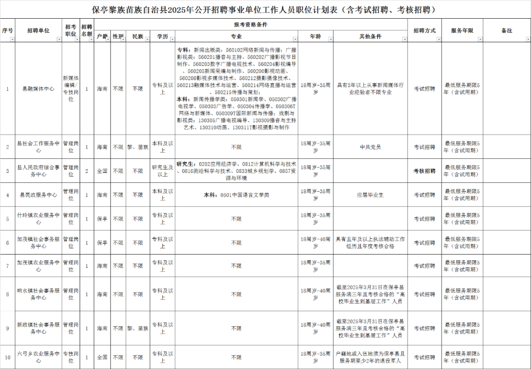 1.保亭黎族苗族自治县2025年公开招聘事业单位工作人员职位表