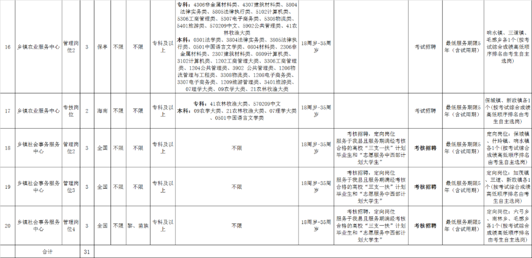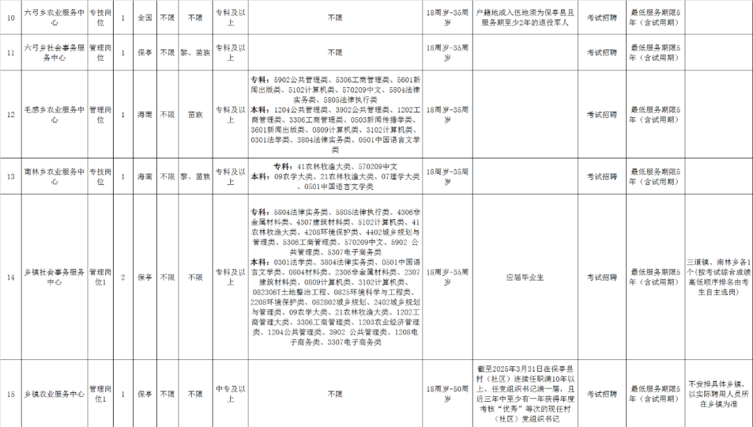 (一)服务于保亭黎族苗族自治县且服务期满经考核合格的高校“三支一扶”计划毕业生和“志愿服务中西部计划大学生”须服务满2年才可报考定向岗位。